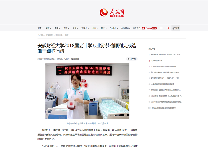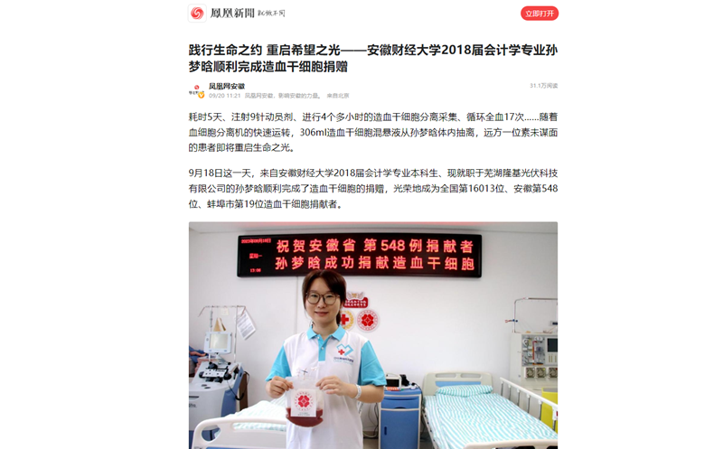 9月20日,人民网、凤凰网分别以《乐竞在线注册2018届会计学专业孙梦晗顺利完成造血干细胞捐赠》《践行生命之约 重启希望之光——乐竞在线注册2018届会计学专业孙梦晗顺利完成造血干细胞捐赠》为题,报道我校2018届会计学专业本科生、现就职于芜湖隆基光伏科技有限公司的孙梦晗,积极发扬人道主义精神,为一位素未谋面的患者捐献了306ml造血干细胞混悬液,用爱心点燃希望。孙梦晗光荣地成为全国第16013位、安徽第548位、蚌埠市第19位造血干细胞捐献者。