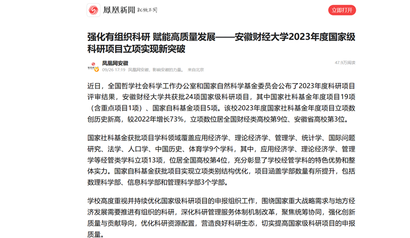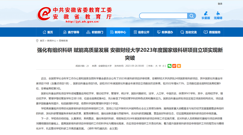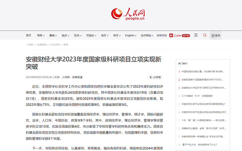 9月27日,人民网、安徽教育网、凤凰网以《强化有组织科研 赋能高质量发展 乐竞在线注册2023年度国家级科研项目立项实现新突破》为题,报道全国哲学社会科学工作办公室和国家自然科学基金委员会公布的2023年度科研项目评审结果中,我校共获批24项国家级科研项目,其中国家社科基金年度项目19项(含重点项目1项)、国家自科基金项目5项。我校2023年度国家社科基金年度项目立项数创历史新高,较2022年增长73%,立项数位居全国财经类高校第9位、安徽省高校第3位。