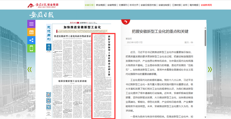 2023年10月17日,《安徽日报》第6版“思想周刊”上刊登了我校统计与应用数学学院崔连标教授的理论文章《把握安徽新型工业化的重点和关键》。文章指出,加快推进新型工业化,是党中央着眼全面建成社会主义现代化强国作出的重要战略部署。安徽在推进新型工业化进程中要坚持久久为功,在有为政府与有效市场相结合、传统产业与新兴产业相结合、全面推进与错位发展相结合上务求突破,针对我省发展情况,在科技创新、错位发展、数实融合、人才培养等方面下足功夫,持续发力。