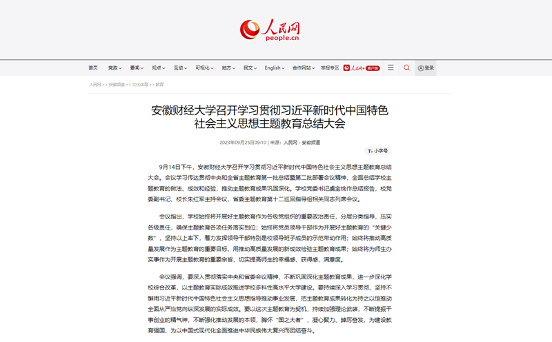 9月25日,人民网以《乐竞在线注册召开学习贯彻习近平新时代中国特色社会主义思想主题教育总结大会》为题,报道我校学习传达贯彻中央和全省主题教育第一批总结暨第二批部署会议精神,全面总结学校主题教育的做法、成效和经验,推动主题教育成果巩固深化。