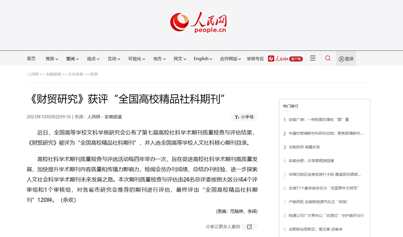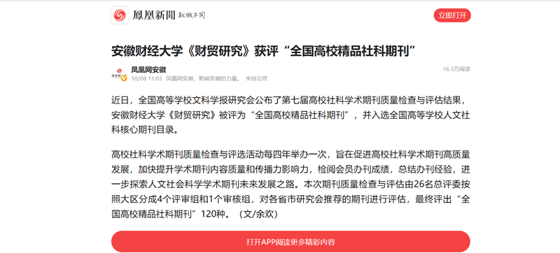 10月8日,人民网、凤凰网以《〈财贸研究〉获评“全国高校精品社科期刊”》为题,报道我校《财贸研究》被评为“全国高校精品社科期刊”,并入选全国高等学校人文社科核心期刊目录。