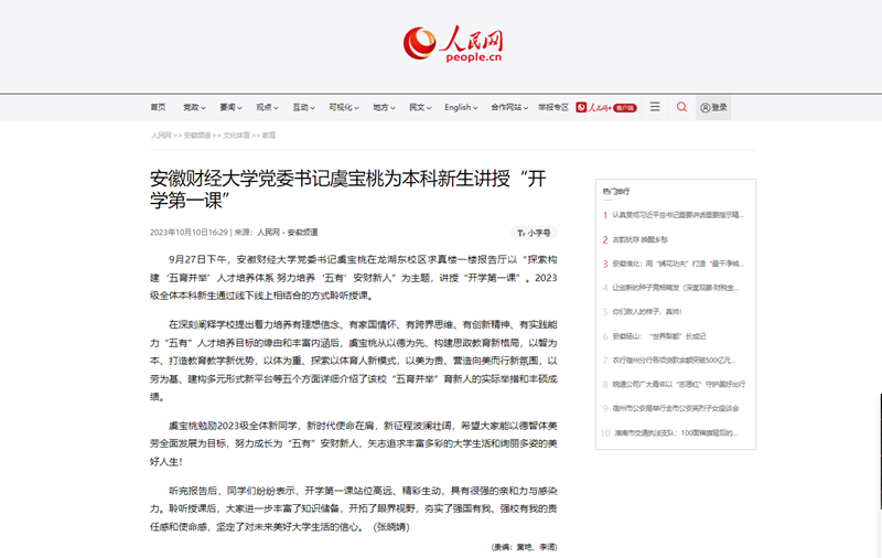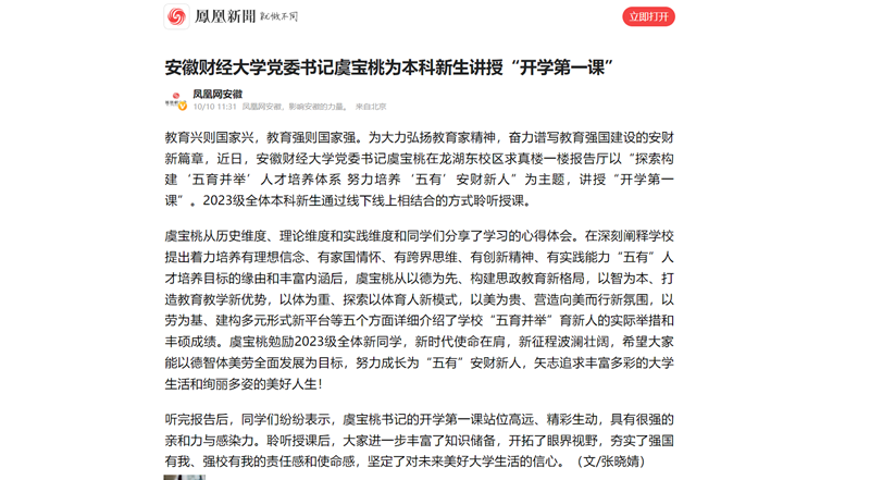 10月10日,人民网、凤凰网以《乐竞在线注册党委书记虞宝桃为本科新生讲授“开学第一课”》为题,报道我校党委书记虞宝桃在龙湖东校区求真楼一楼报告厅以“探索构建‘五育并举’人才培养体系 努力培养‘五有’安财新人”为主题,讲授“开学第一课”。2023级全体本科新生通过线下线上相结合的方式聆听授课。