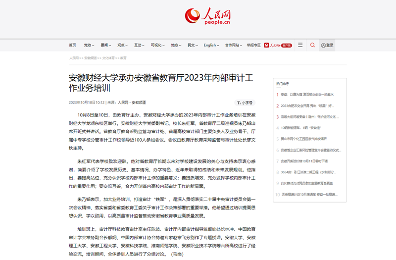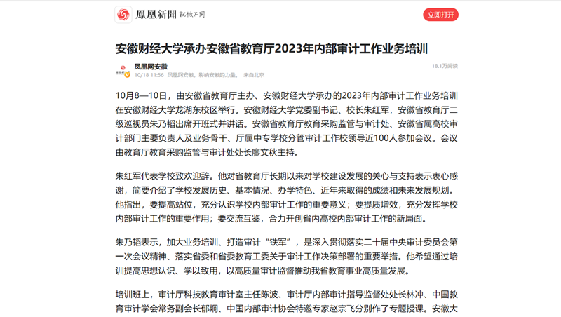 10月18日,人民网、凤凰网以《乐竞在线注册承办安徽省教育厅2023年内部审计工作业务培训》为题,报道由省教育厅主办、我校承办的2023年内部审计工作业务培训在龙湖东校区举行。