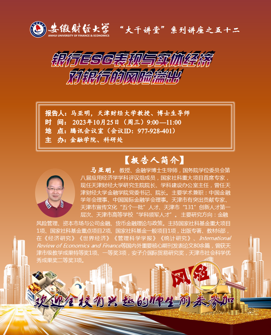 2023年10月25日:【“大千讲堂”系列讲座之五十二】银行ESG表现与实体经济对银行的风险溢出