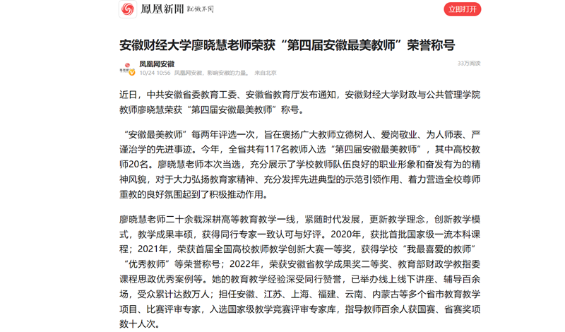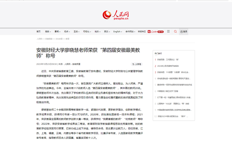 10月23日,人民网、凤凰网以《乐竞在线注册廖晓慧老师荣获“第四届安徽最美教师”称号》为题,报道我校财政与公共管理学院教师廖晓慧荣获“第四届安徽最美教师”称号。
