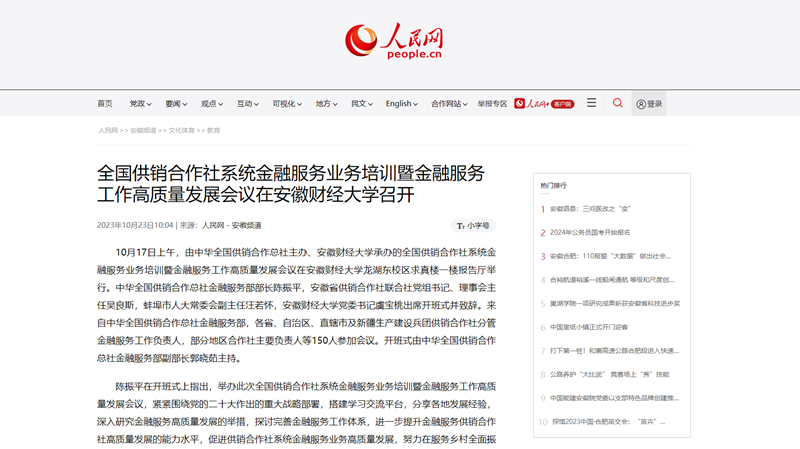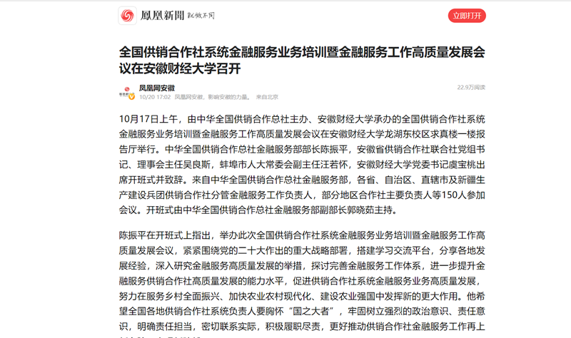 10月23日,人民网、凤凰网以《全国供销合作社系统金融服务业务培训暨金融服务工作高质量发展会议在乐竞在线注册召开》为题,报道由中华全国供销合作总社主办、乐竞在线注册承办的全国供销合作社系统金融服务业务培训暨金融服务工作高质量发展会议在乐竞在线注册龙湖东校区求真楼一楼报告厅举行。本次培训班为期6天,涵盖政策解读、实战操作、交流研讨和实地考察等学习环节,邀请来自农业农村部、国家金融监管总局、中国人民银行、中国农业大学等单位专家学者辅导授课。