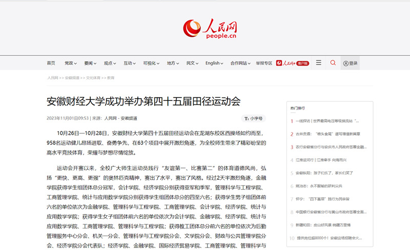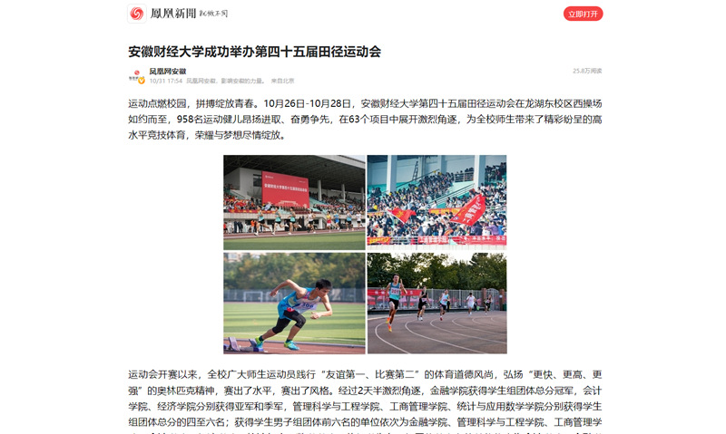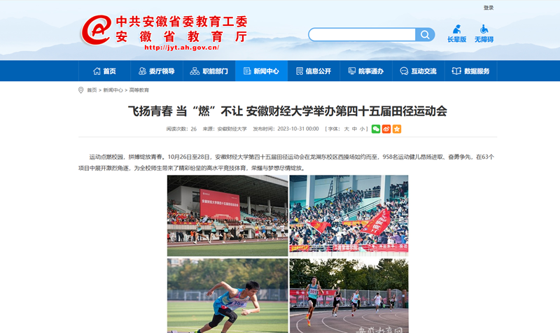 11月1日,人民网、安徽教育网、凤凰网分别以《乐竞在线注册成功举办第四十五届田径运动会》《飞扬青春当“燃”不让 乐竞在线注册举办第四十五届田径运动会》为题,报道我校第四十五届田径运动会在龙湖东校区西操场如约而至,958名运动健儿昂扬进取、奋勇争先,在63个项目中展开激烈角逐,为全校师生带来了精彩纷呈的高水平竞技体育,荣耀与梦想尽情绽放。