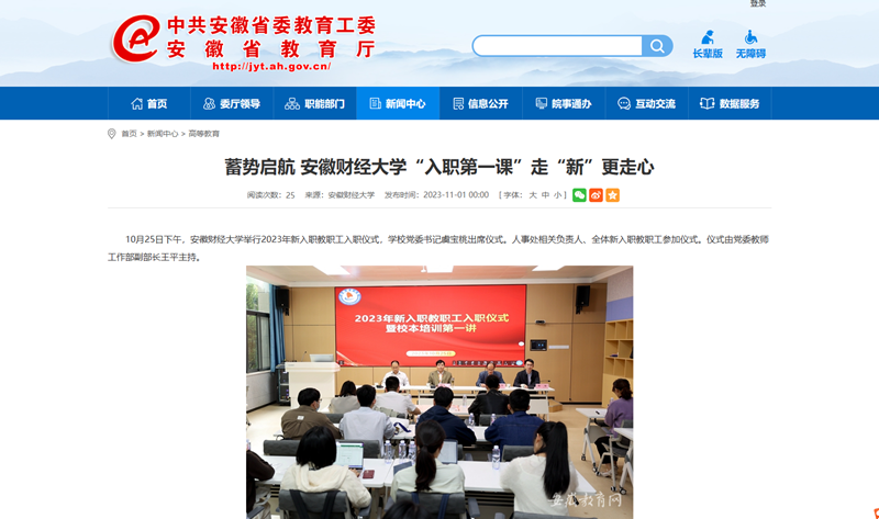 11月1日,安徽教育网以《蓄势启航 乐竞在线注册“入职第一课”走“新”更走心》为题,报道我校举行2023年新入职教职工入职仪式,校党委书记虞宝桃为学员们讲授校本培训第一讲《关于党的教育方针的学习思考》。