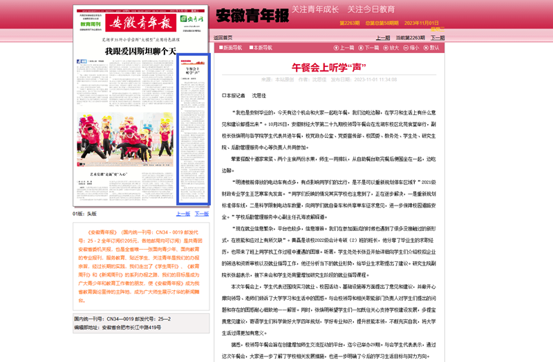 11月1日,《安徽青年报》01版刊发名为《午餐会上听学“声”》的文章,报道我校开展第二十九期校领导午餐会活动。