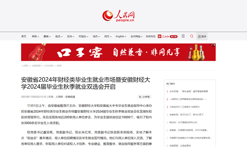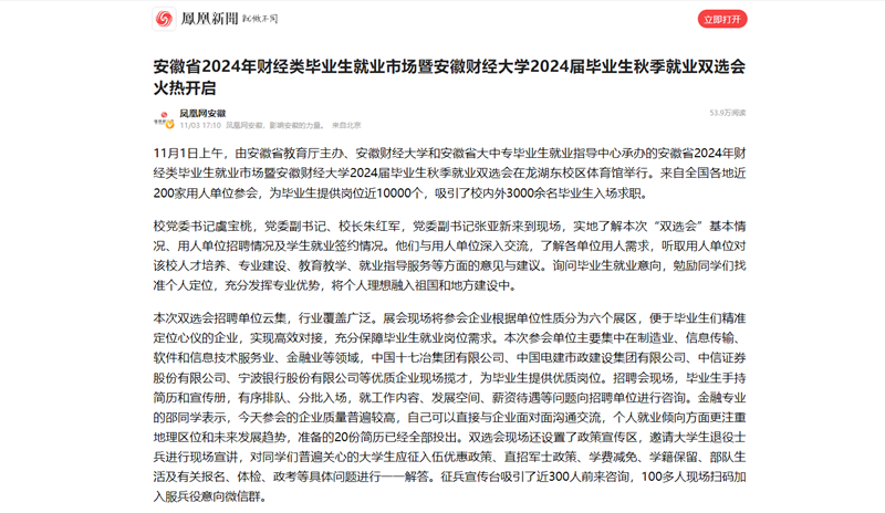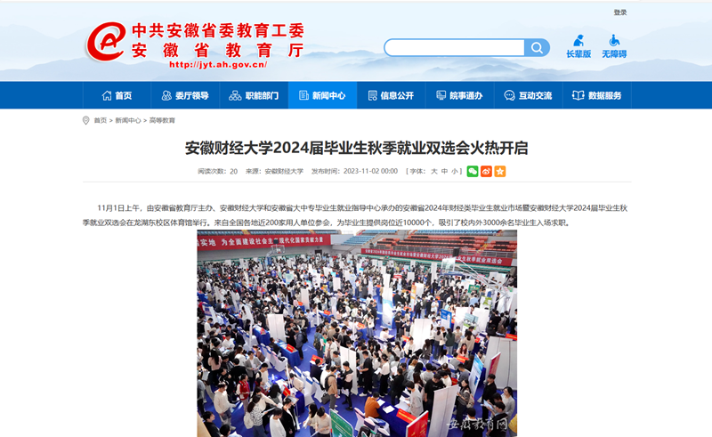 近日,人民网、安徽新闻联播、安徽教育网、安徽县域新闻联播、凤凰网聚焦我校扎实做好毕业生就业工作,积极搭建就业平台,持续优化就业服务,在日前学校举办的安徽省2024年财经类毕业生就业市场暨乐竞在线注册2024届毕业生秋季就业双选会上,有近200家用人单位参会,提供就业岗位将近10000个。