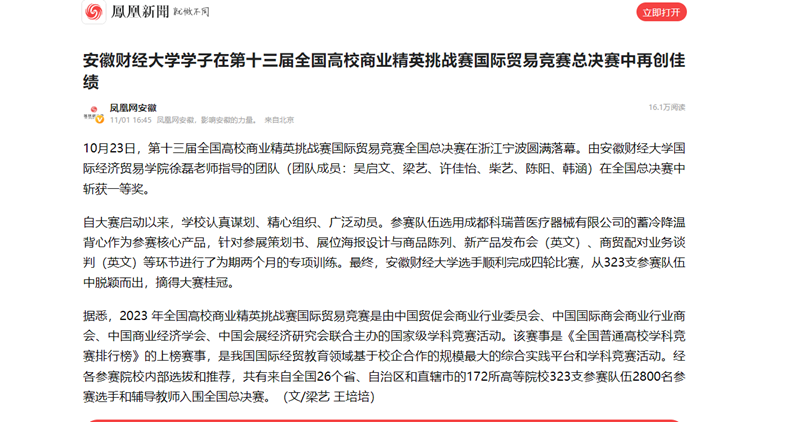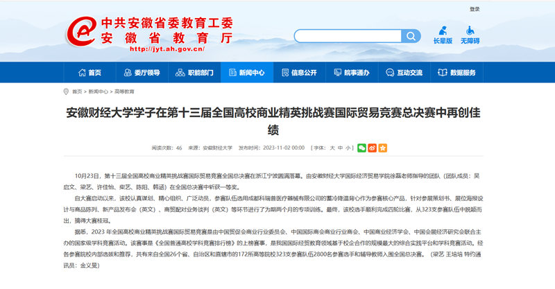 11月2日,安徽教育网、凤凰网以《乐竞在线注册学子在第十三届全国高校商业精英挑战赛国际贸易竞赛总决赛中再创佳绩》为题,报道我校国际经济贸易学院徐磊老师指导的团队(团队成员:吴启文、梁艺、许佳怡、柴艺、陈阳、韩涵)在第十三届全国高校商业精英挑战赛国际贸易竞赛总决赛中斩获一等奖。