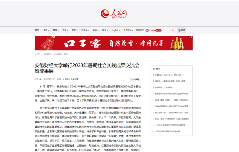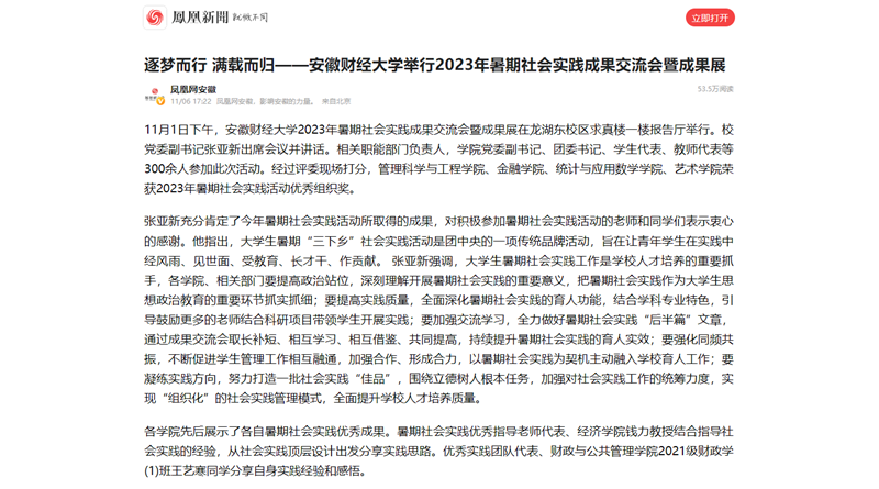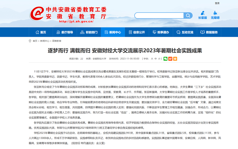 11月6日,人民网、安徽教育网、凤凰网以《乐竞在线注册举行2023年暑期社会实践成果交流会暨成果展》为题,报道我校2023年暑期社会实践成果交流会暨成果展于11月1日下午在龙湖东校区求真楼一楼报告厅举行。今年6月我校正式启动暑期社会实践,在前期申报的基础上,全校共组建实践团队993支,其中国家级重点团队31支、省级重点团队5支、校级重点团队113支,参与人次高达13000余人,形成千万字调研报告、实践感悟和队员手记,收到来自实践地点的多封回函和感谢信。