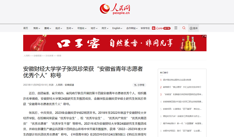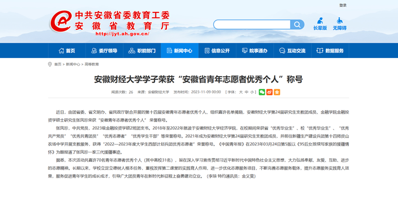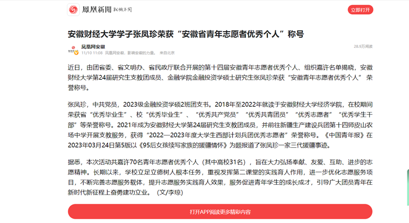 近日,人民网、安徽教育网、凤凰网以《乐竞在线注册学子张凤珍荣获“安徽省青年志愿者优秀个人”称号》为题,报道我校第24届研究生支教团成员、金融学院金融投资学硕士研究生张凤珍荣获“安徽青年志愿者优秀个人”荣誉称号。