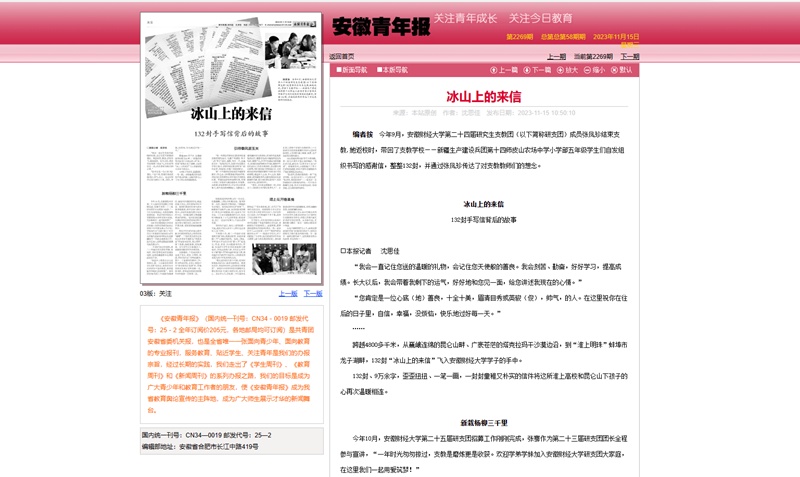 11月15日,《安徽青年报》第三版以《冰山上的来信——132封手写信背后的故事》为题,整版报道了我校第二十四届研究生支教团的先进事迹。