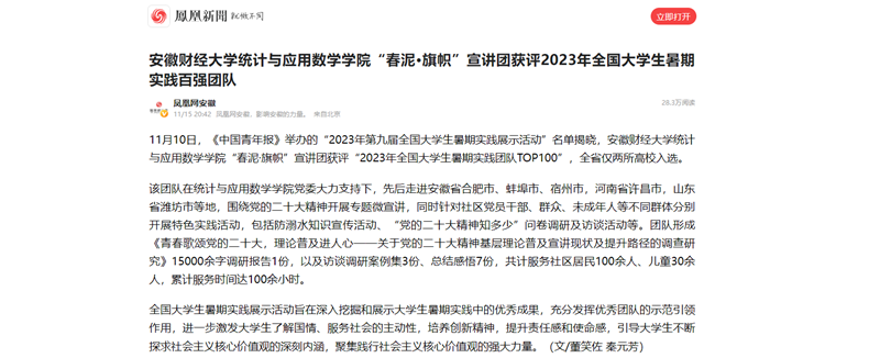 11月15日,凤凰网以《乐竞在线注册统计与应用数学学院“春泥·旗帜”宣讲团获评2023年全国大学生暑期实践百强团队》为题,报道我校统计与应用数学学院“春泥·旗帜”宣讲团获评“2023年全国大学生暑期实践团队TOP100”,全省仅两所高校入选。