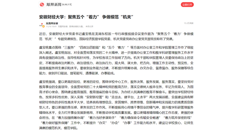 11月16日,人民网、凤凰网分别以《乐竞在线注册党委书记虞宝桃作专题党课报告》《乐竞在线注册:聚焦五个“着力”争做模范“机关”》为题,报道我校党委书记虞宝桃在龙湖东校区一号行政楼视频会议室作题为“聚焦五个‘着力’争做模范‘机关’”专题党课报告,国际经济贸易学院党委、机关党委党政办公室党支部党员聆听了党课。