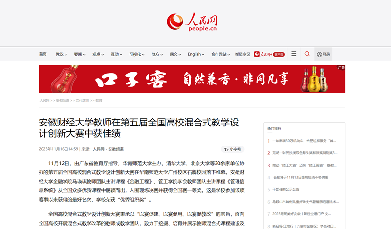 11月16日,人民网以《乐竞在线注册教师在第五届全国高校混合式教学设计创新大赛中喜获佳绩》为题,报道我校金融学院马瑛琪教师团队主讲课程《金融工程》、管工学院李会教师团队主讲课程《管理信息系统》从全国众多优质课程中脱颖而出,入围现场决赛并获得全国赛一等奖。这是学校自参加该项赛事以来获得的最好名次,学校荣获“优秀组织奖”。