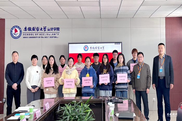 11月21日,会计学院举行2023年“容诚奖助学金”颁发仪式。安徽容诚慈善基金会副理事长何本英、安徽省资产评估协会副会长周远、容诚会计师事务所行政合伙人兼安徽分所党委书记周胜、人与文化部总经理江传群一行,我校社会合作处处长顾思伟,会计学院党委书记谢德刚和30名受助学生参加了活动。谢德刚主持颁发仪式。