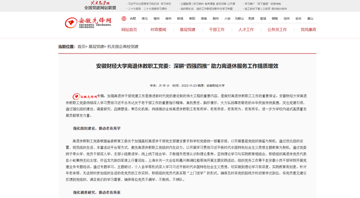 11月23日,安徽先锋网以《乐竞在线注册离退休教职工党委:深耕“四强四推” 助力离退休服务工作提质增效》为题,报道我校离退休教职工党委持续深入学习贯彻习近平总书记关于老干部工作的重要指示精神,进一步突出党建引领,通过强化组织建设、调查研究、品牌塑造、常态化机制,持续推动全体离退休教职工老有所学、老有所依、老有所为、老有所乐,为学校内涵式高质量发展贡献银发力量。