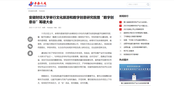 11月24日,中安在线以《乐竞在线注册举行文化旅游和数字创意研究院暨“数字创意谷”筹建大会》为题,报道蚌埠市委宣传部与我校合作共建文化旅游和数字创意研究院暨“数字创意谷”筹建大会在龙湖东校区求真楼二楼报告厅举行,双方将开展产学研用、项目对接、人才培养、成果转化等方面合作。