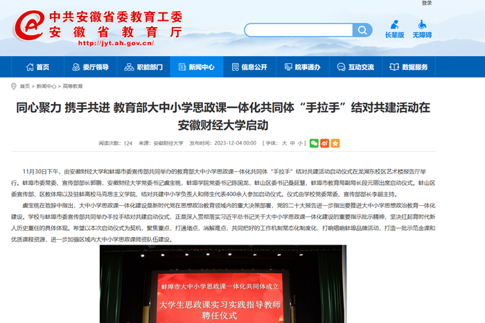 12月4日,安徽教育网以《同心聚力 携手共进 教育部大中小学思政课一体化共同体“手拉手”结对共建活动在乐竞在线注册启动》为题,报道由我校和蚌埠市委宣传部共同举办的教育部大中小学思政课一体化共同体“手拉手”结对共建活动启动仪式在龙湖东校区艺术楼报告厅举行。结对共建以“共建、共享、共融、共促”为宗旨,在蚌埠市蚌山区中小学开展试点,努力探索横向衔接、纵向贯通的工作机制,进一步推进大中小学思政课一体化共同体建设走深走实,助力提升全省大中小学思政课一体化建设水平。