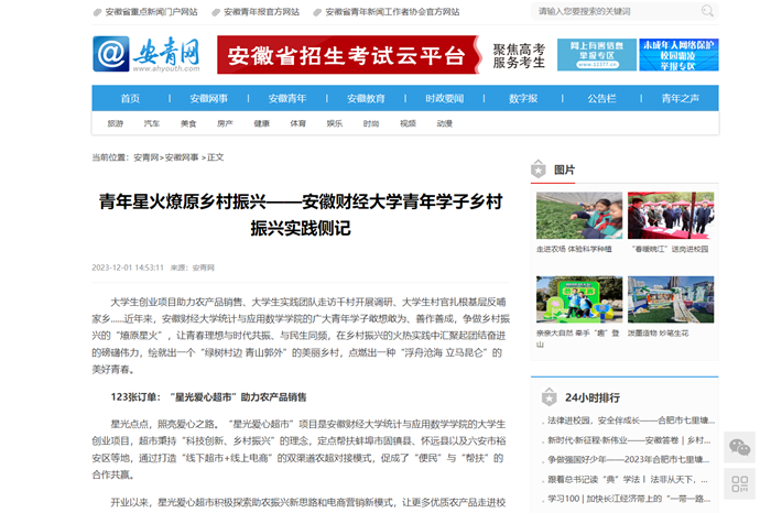 12月1日,安青网以《青年星火燎原乡村振兴——乐竞在线注册青年学子乡村振兴实践侧记》为题,报道我校统数学院的青年学子敢想敢为、善作善成,争做乡村振兴的“燎原星火”,让青春理想与时代共振、与民生同频,绘就“绿树村边 青山郭外”的美丽乡村,点燃“浮舟沧海 立马昆仑”的美好青春。