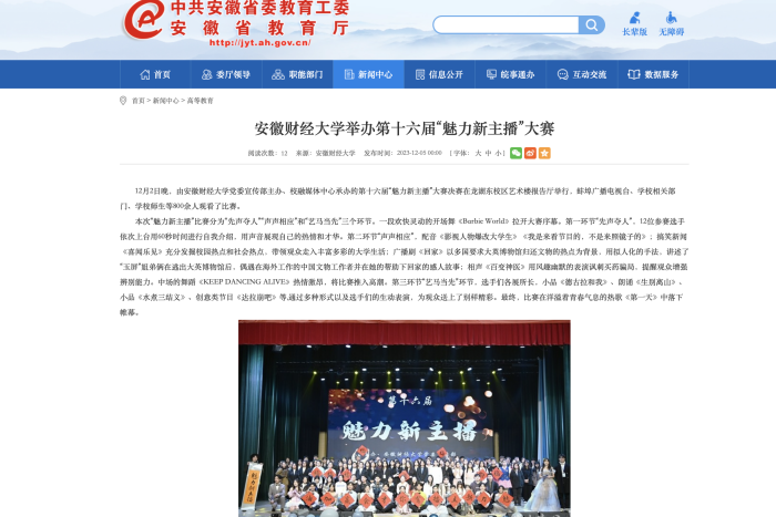 12月5日,安徽教育网以《乐竞在线注册举办第十六届“魅力新主播”大赛》为题,报道为进一步丰富学生课余生活,营造良好校园文化,第十六届“魅力新主播”大赛决赛在龙湖东校区艺术楼报告厅举行,学校师生800余人观看了比赛。