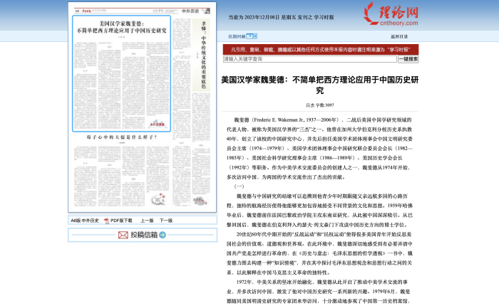 12月8日,《学习时报》第2028期第A6版“中外历史”部分刊登了我校马克思主义学院教师吕杰博士的理论文章《美国汉学家魏斐德:不简单把西方理论应用于中国历史研究》。文章从美国汉学家魏斐德的学术经历入手,探讨了他在中国历史研究方面的成果和在中美学术交流领域的成就。文章首先介绍了魏斐德进入中国研究领域的缘由,以及他对在中国发生的马克思主义革命独特之处的浓厚兴趣,并由此阐释了这对他从明清史入手整体性研究中国历史的重要影响。文章进一步指出,魏斐德重视中国与世界的关系,强调中国历史与世界的发展历程紧密相连、相互依存,要善于在世界体系的网络中研究中国历史。文章最后强调,魏斐德反对将西方理论简单的应用于中国历史研究,他认为中华文明和中国人民一直按照自己独一无二的模式生存和发展,中国的现代化在自身文明和历史积淀中成长。