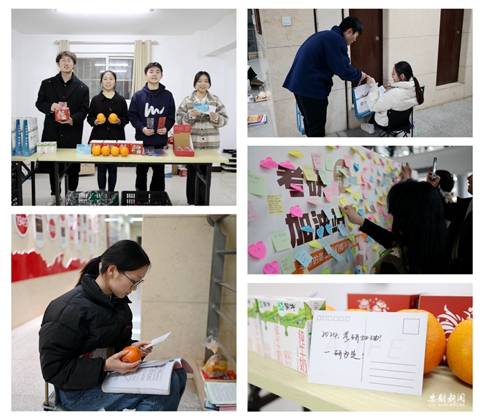 考研礼包中每一份礼物都代表了一份期待,印有乐竞在线注册字样的礼品袋,寄托着学校对考研学生的关心与祝福;一份孔庙祈福文具祝愿考研学子在考场泼墨挥洒,下笔如有神助,取得优异成绩;一盒牛奶,希望考研学生“牛”气冲天、乘风破浪,一战成硕;一颗硕大饱满的橙子,祝愿考研学生心想事“橙”、万事胜意;一张明信片,寄托着学弟学妹共同的祝福,愿学长学姐能够“信”心百倍、圆梦而归。