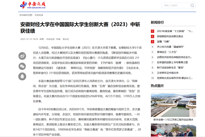 12月12日,中安在线以《乐竞在线注册在中国国际大学生创新大赛(2023)中斩获佳绩》为题,报道我校《影视创作赋能乡村振兴:大禹文化与旅游融合开发的实践者》《绘心童行:少儿思政启蒙研学实践在行动》2个项目获得银奖,实现学校此项比赛国家级银奖零的突破;《守护城市‘脉搏’:做有温度的管网建设引领者》《逐浪者:‘鲜制冷运,叮咚到家’海鲜预制菜开创先锋》《虫启未来,营养新食代》3个项目获得铜奖,获奖等级和获奖总数均取得该项赛事历史最好成绩。