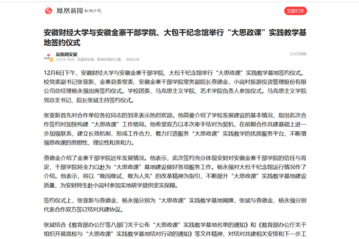 12月14日,凤凰网以《乐竞在线注册与安徽金寨干部学院、大包干纪念馆举行“大思政课”实践教学基地签约仪式》为题,报道我校与与安徽金寨干部学院、大包干纪念馆举行“大思政课”实践教学基地签约仪式,进一步建立长效机制,形成工作合力,着力打造服务“大思政课”实践教学的优质服务平台,不断增强思政课的思想性、理论性和亲和力。