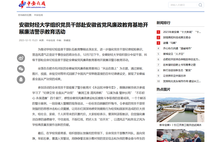 12月15日,中安在线以《乐竞在线注册组织党员干部赴安徽省党风廉政教育基地开展廉洁警示教育活动》为题,报道为推动学校纪检监察干部队伍教育整顿走深走实,进一步强化党员干部纪律规矩意识,营造风清气正劲足干事创业的政治生态,我校组织部分中层干部、科级干部和全体纪检监察干部赴安徽省党风廉政教育基地开展廉洁警示教育活动。