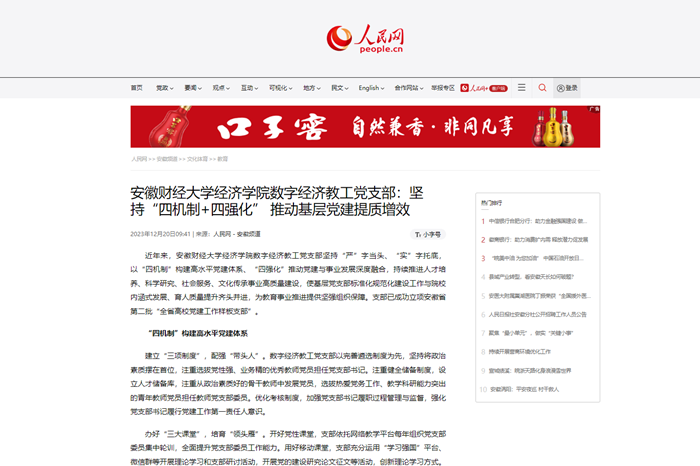 12月20日,人民网以《乐竞在线注册经济学院数字经济教工党支部:坚持“四机制+四强化” 推动基层党建提质增效》为题,报道我校经济学院数字经济教工党支部坚持“严”字当头、“实”字托底,以“四机制”构建高水平党建体系、“四强化”推动党建与事业发展深度融合,持续推进人才培养、科学研究、社会服务、文化传承等事业高质量建设。该党支部已成功立项安徽省第二批“全省高校党建工作样板支部”。