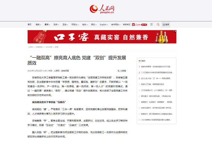 12月26日,人民网以《“一融双高”擦亮育人底色 党建“双创”提升发展质效》为题,报道我校工管学院作为首批“全国党建工作样板支部”、安徽省五星党支部,在主题教育中牢牢把握“学思想、强党性、重实践、建新功”总要求,不断探索以“一流党建促一流学科、产一流专业、推一流课程、建一流师资、育一流人才”的党建引领模式,通过“一融双高”擦亮育人“底色”,通过党建“双创”提升发展质效,有力发挥了全国党建工作样板支部的示范带动作用。