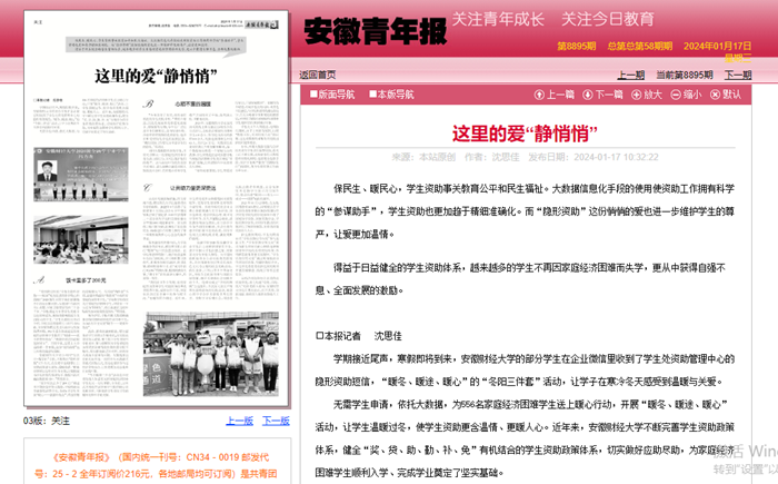 1月17日,《安徽青年报》03版以《这里的爱“静悄悄”》为题,整版报道我校充分利用“信息化+数字化”手段,不断优化“隐形资助”方式方法,进一步完善学生资助体系,让越来越多的学生不再因家庭经济困难而失学,更从中获得自强不息、全面发展的激励。