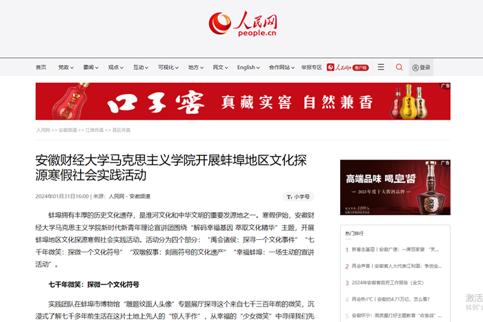 1月30日,人民网以《乐竞在线注册马克思主义学院开展蚌埠地区文化探源寒假社会实践活动》为题,报道我校马克思主义学院新时代新青年理论宣讲团围绕“解码幸福基因 萃取文化精华”主题,开展蚌埠地区文化探源寒假社会实践活动。“新时代新青年理论宣讲团”将围绕蚌埠地区丰富的文化资源开展深入研究并进行理论宣讲教学转化,讲好幸福中国、幸福蚌埠的故事,进一步解锁幸福基因、萃取文化精华。