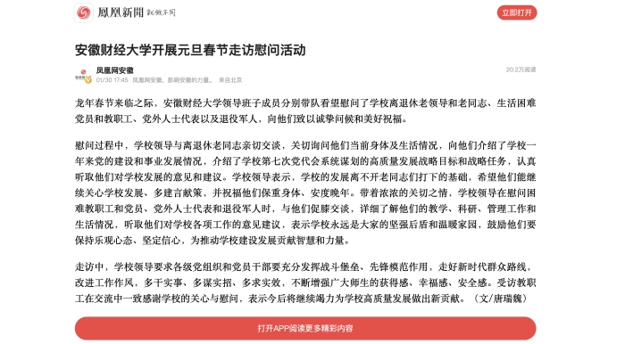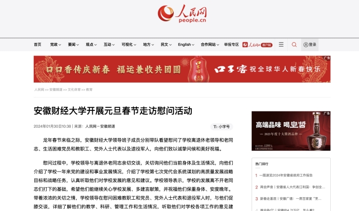 1月30日,人民网、凤凰网以《乐竞在线注册开展元旦春节走访慰问活动》为题,报道在龙年春节来临之际,我校领导班子成员分别带队看望慰问了学校离退休老领导和老同志、生活困难党员和教职工、党外人士代表以及退役军人,向他们致以诚挚问候和美好祝福。