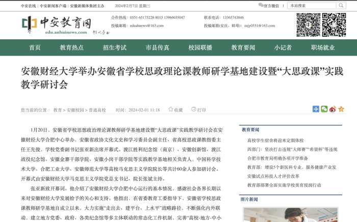 2月1日,中安教育网以《乐竞在线注册举办安徽省学校思政理论课教师研学基地建设暨“大思政课”实践教学研讨会》为题,报道安徽省学校思想政治理论课教师研学基地建设暨“大思政课”实践教学研讨会在我校合肥中心举办,通过集中交流研讨,为校馆深度合作搭建新型工作协同平台,多方汇聚智慧和资源,共促培育时代新人。