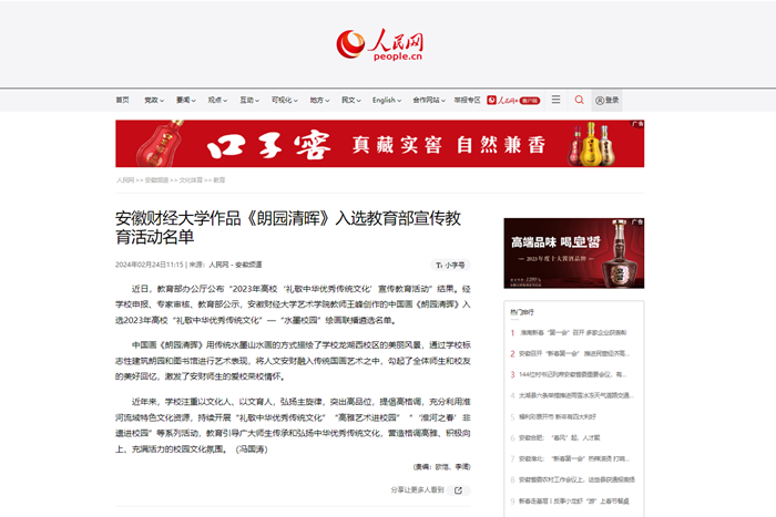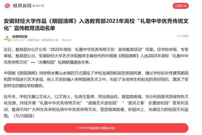 2月24日,人民网、凤凰网以《乐竞在线注册作品《朗园清晖》入选教育部宣传教育活动名单》为题,报道我校艺术学院教师王峰创作的中国画《朗园清晖》入选2023年高校“礼敬中华优秀传统文化”—“水墨校园”绘画联播遴选名单。
