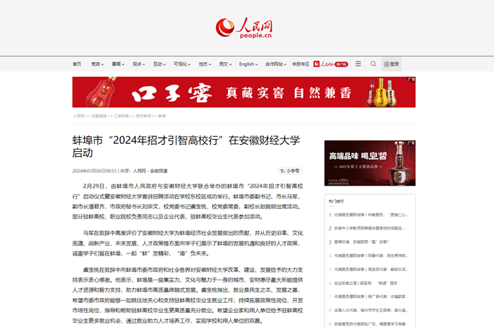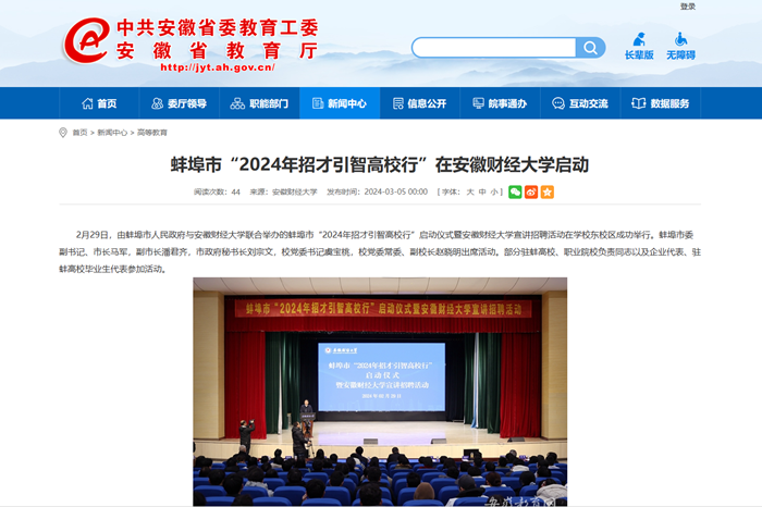 3月6日,人民网、安徽教育网以《蚌埠市“2024年招才引智高校行”在乐竞在线注册启动》为题,报道由蚌埠市人民政府与乐竞在线注册联合举办的蚌埠市“2024年招才引智高校行”启动仪式暨乐竞在线注册宣讲招聘活动在学校东校区成功举行。现场有丰原集团、中国联通、中国人保、中建材旗下子公司等66家用人单位参展,提供岗位1262个,吸引了近千名来自乐竞在线注册、蚌埠学院、蚌埠工商学院等高校毕业生前往。