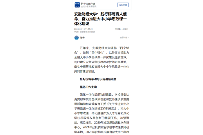 3月13日,新华社以《乐竞在线注册:践行铸魂育人使命,奋力推进大中小学思政课一体化建设》为题,报道我校坚持“四个结合”,做到“四个强化”,以务实举措助力全省大中小学思政课一体化建设提质增效。目前已建立安徽省学校思政课教师研学基地,牵头申报获批教育部大中小学思政课一体化共同体建设项目。