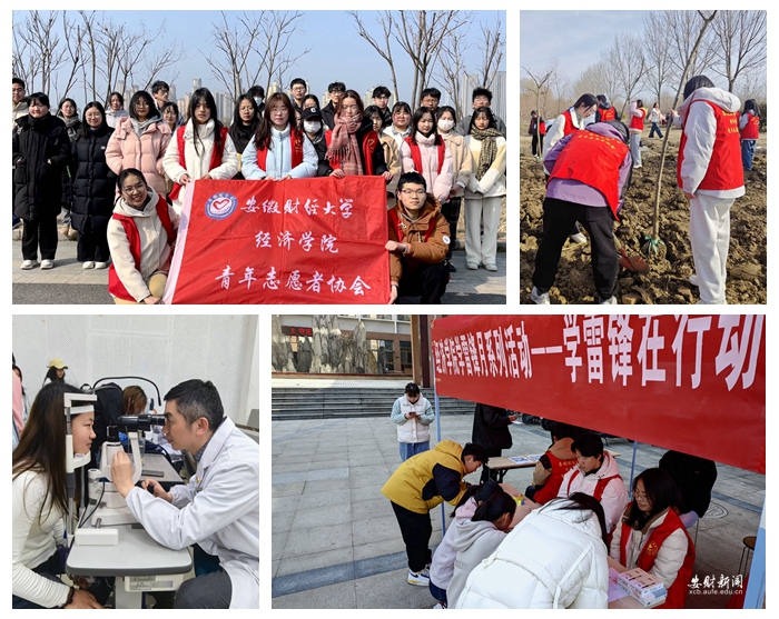校园中,学院志愿者们组建校园文明岗,早早到岗开展课堂考勤、校园清扫、规范车辆停放等志愿服务活动,加强自我管理、自我教育、自我服务;宿舍楼里,志愿者们开展宿舍安全检查、垃圾出宿舍志愿服务活动,营造干净整洁的宿舍环境;龙子湖风景区中,志愿者们开展景区导游、景点讲解、文明旅游宣传、垃圾清扫等志愿服务活动,以最饱满的热情真诚迎接游客,为推进文明城市建设贡献光和热;在蚌埠梅花山苗木基地中,志愿者们分工协作,挖坑、扶树、培土、浇水,经过努力,40余棵树苗被悉心栽种,在春光沐浴下展现出勃勃生机;学院联合蚌埠爱尔眼科医院,共同开展“雷锋月”公益行活动,在学生群体中开展视力普查,进行护眼知识宣讲。