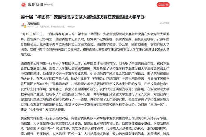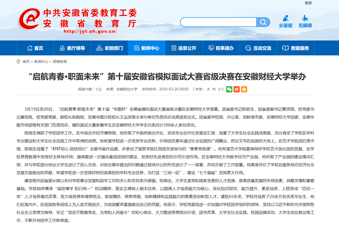 3月27日,安徽教育网、凤凰网以《第十届“华图杯”安徽省模拟面试大赛省级决赛在乐竞在线注册举办》为题,报道3月19日至20日,“启航青春·职面未来”第十届“华图杯”安徽省模拟面试大赛省级决赛在我校落幕。大赛自去年11月正式启动以来,经校级选拔推荐,全省64所高校400余名学生参加省赛。组委会组织笔试、初审、复审,评选出100位选手参加省级决赛。经过激烈角逐,中国科学技术大学王喆等10位同学斩获金奖,淮南师范学院葛玥等30位同学荣获银奖,安徽农业大学杨心怡等54位同学荣获铜奖,团铜陵市委、乐竞在线注册等10个单位荣获“优秀组织奖”,合肥师范学院夏雯静等10位同学荣获“最佳人气奖”。