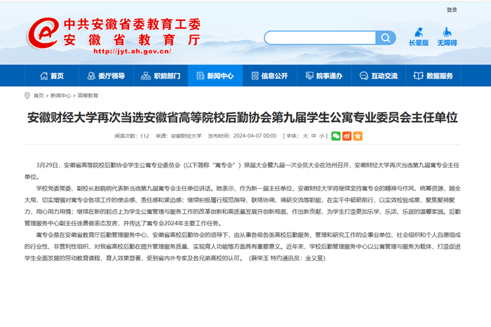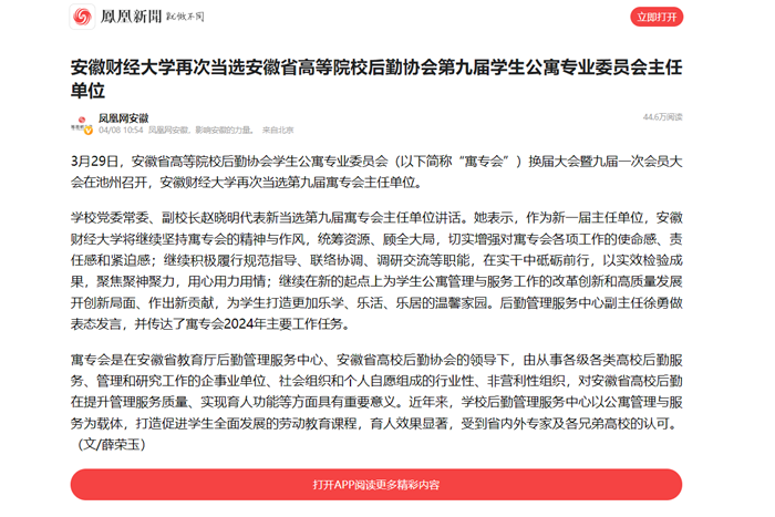 4月8日,安徽教育网、凤凰网以《乐竞在线注册再次当选安徽省高等院校后勤协会第九届学生公寓专业委员会主任单位》为题,报道在刚刚落幕的安徽省高等院校后勤协会学生公寓专业委员会换届大会暨九届一次会员大会,我校再次当选第九届寓专会主任单位。