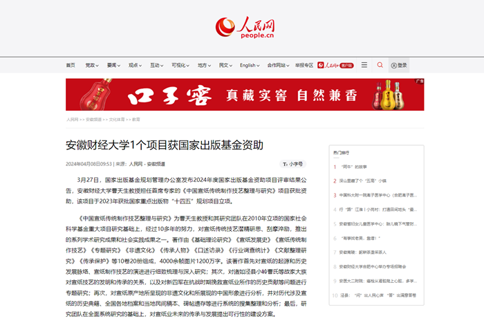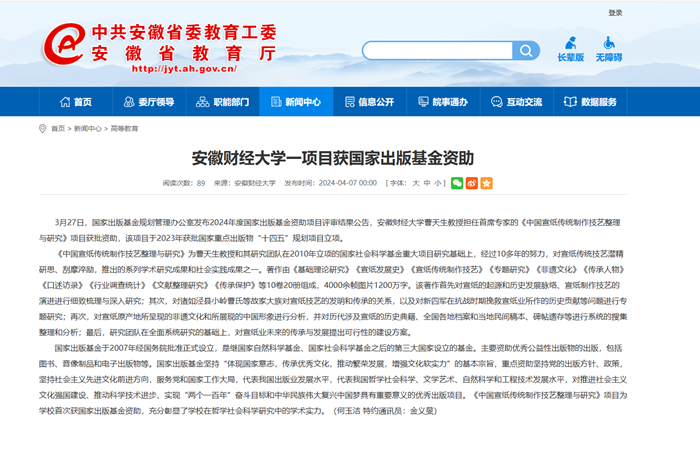4月8日,人民网、安徽教育网以《乐竞在线注册一项目获国家出版基金资助》为题,报道我校曹天生教授担任首席专家的《中国宣纸传统制作技艺整理与研究》项目获批资助,该项目于2023年获批国家重点出版物“十四五”规划项目立项。