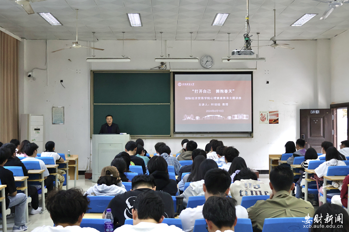 4月10日下午,国际经济贸易学院在龙湖东校区明德楼101教室举办“打开自己·拥抱春天”心理健康教育主题活动,邀请了优秀校友、蚌埠医科大学叶培结教授担任主讲。活动由学院党委书记胡尊亮主持,辅导员代表和百余名2023级学生参加本次活动。