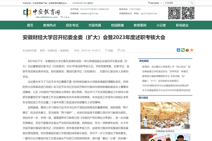 4月16日,中安教育网以《乐竞在线注册召开纪委全委(扩大)会暨2023年度述职考核大会》为题,报道我校纪委在龙湖东校区一号行政楼视频会议室召开纪委全委(扩大)会议暨基层纪委书记(纪检委员)2023年度述职考核大会。