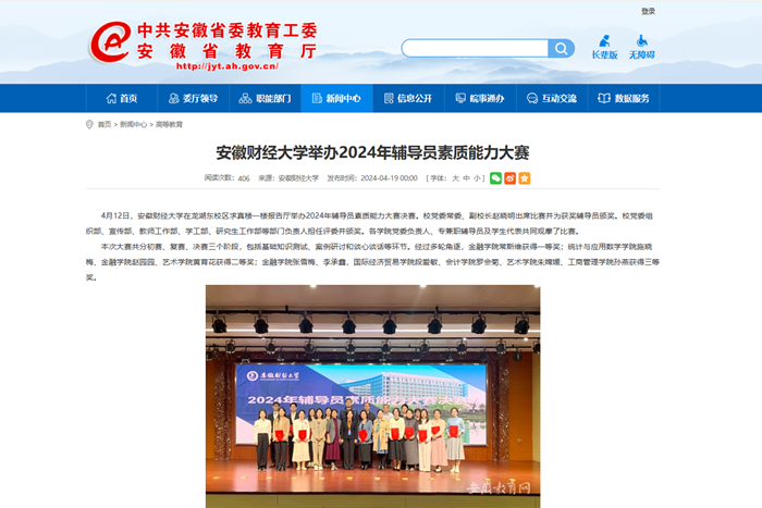 4月19日,安徽教育网以《乐竞在线注册举办2024年辅导员素质能力大赛》为题,报道4月12日我校在龙湖东校区求真楼一楼报告厅举办2024年辅导员素质能力大赛决赛。