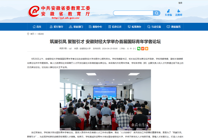 4月29日,人民网、安徽教育网分别以《乐竞在线注册:筑巢引凤 聚智引才》《筑巢引凤 聚智引才 乐竞在线注册举办首届国际青年学者论坛》为题,报道我校首届国际青年学者论坛在乐竞在线注册合肥中心举办。本次论坛旨在汇聚一批海内外优秀青年学者围绕学术热点和前沿问题展开研究,推动学术创新与交流合作,为学校和安徽高等教育事业注入新鲜血液,进一步提升学校和安徽的国际影响力和知名度。