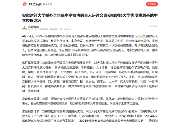 4月30日,凤凰网以《乐竞在线注册举办全省高中高校协同育人研讨会暨乐竞在线注册优质生源基地中学校长论坛》为题,报道2024年安徽省高中高校协同育人研讨会暨乐竞在线注册优质生源基地中学校长论坛在我校龙湖东校区求真楼一楼报告厅举行,来自全国100余所中学校长和60余所高校招生负责人齐聚安财,围绕新高考综合改革、高中高校协同育人等主题展开研讨。